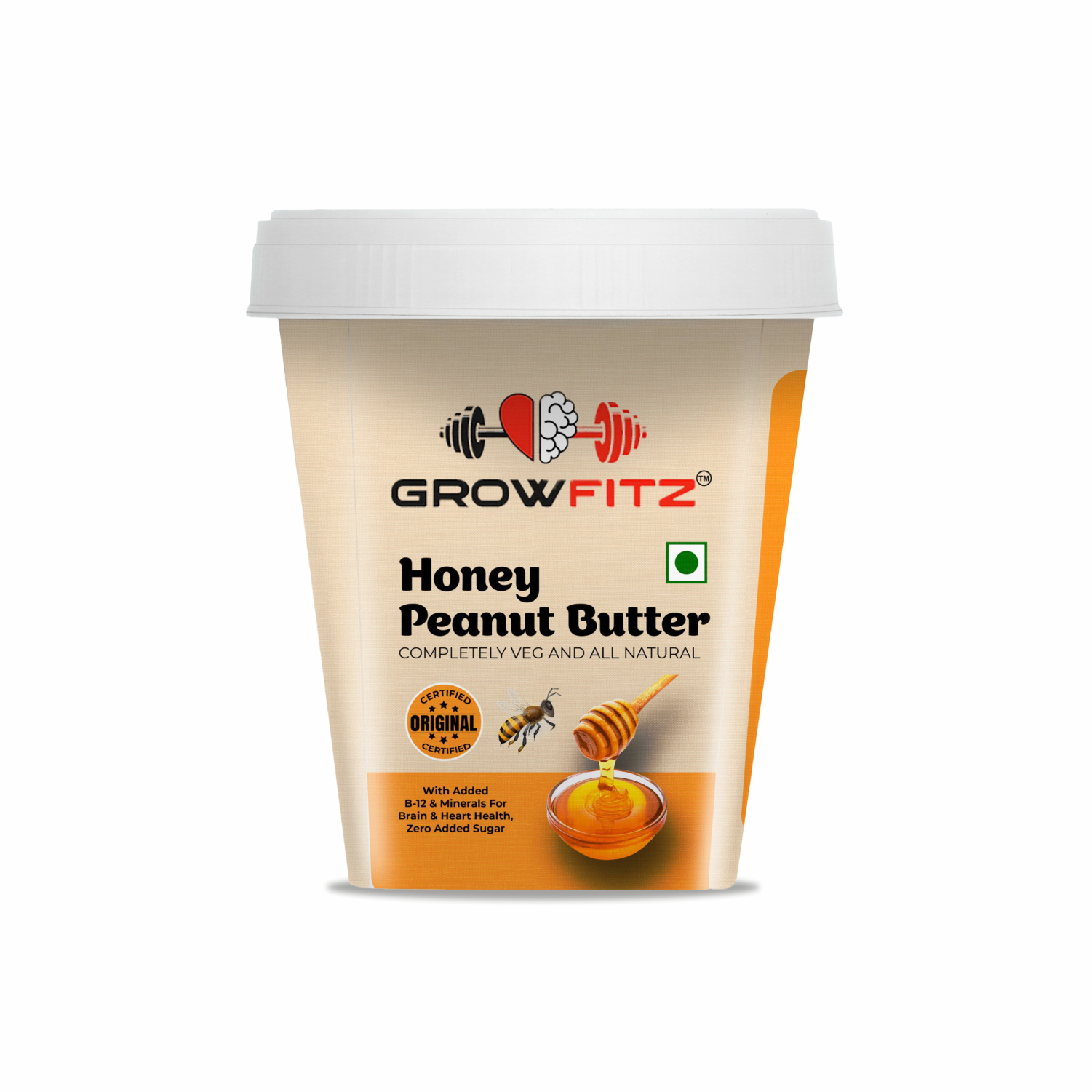Fuel your fitness with Growfitz Peanut Butter with Natural Honey, 21g protein per serving, zero added sugar, high fiber, and no preservatives. Gluten-free and non-GMO, this 500g jar is a clean, tasty energy source for workouts, muscle recovery, or everyday nutrition.
