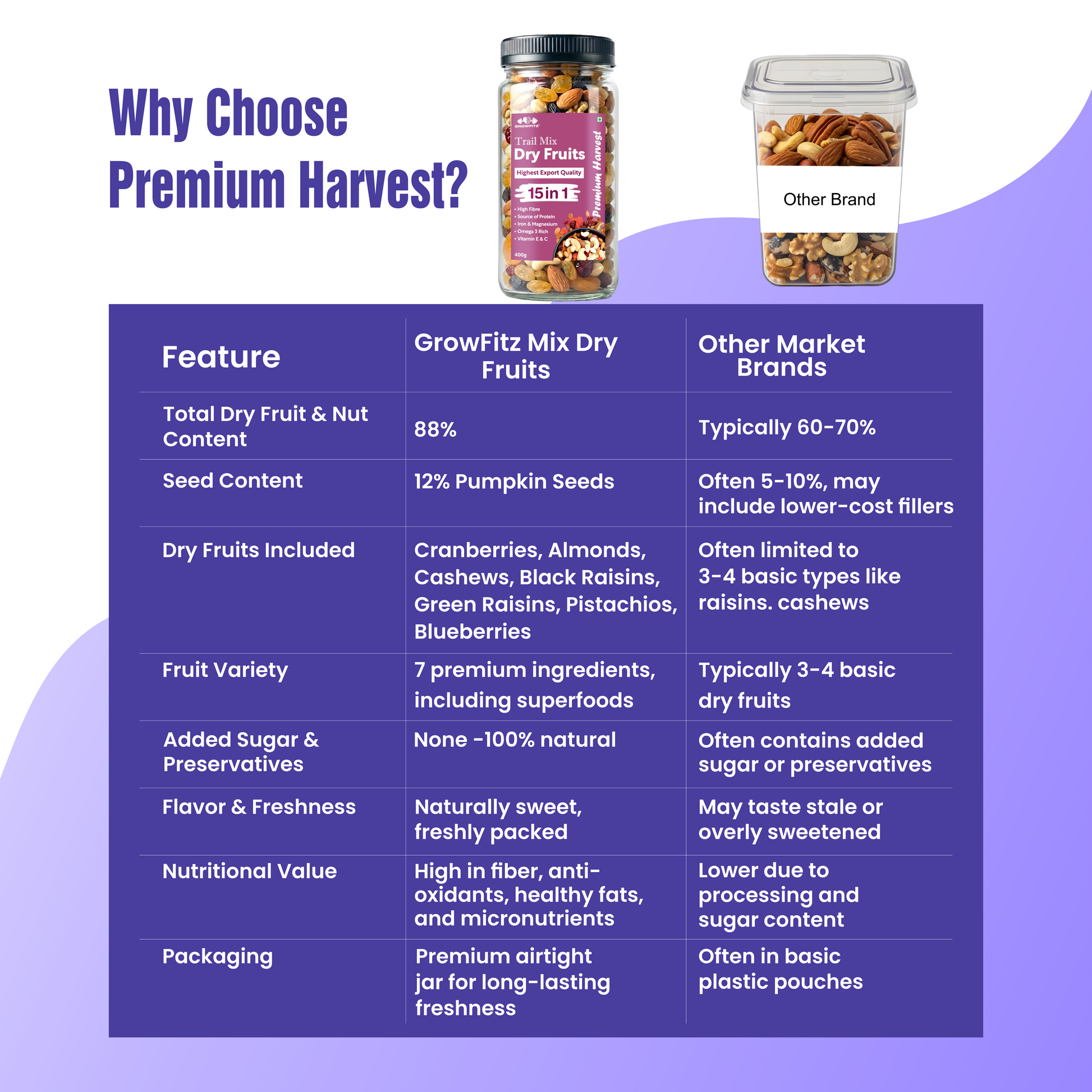 Elevate your snacking with Growfitz 15-in-1 Trail Mix, a nutrient-rich blend of handpicked dry fruits and berries including Cashews, Almonds, Figs, Cranberries, Pistachios, Dates, Cherries, and more. Packed with fiber, antioxidants, vitamins, and healthy fats, it’s perfect for energy boosts, post-workout snacks, or breakfast bowls.
